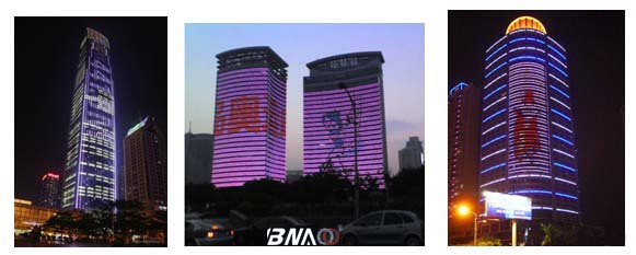 戶外廣告機載體,人們通過LED、激光、投影等各種技術手段,設法讓整幢大樓變成一個立體的光電廣告載體,這種技術被稱為“建筑媒體”技術,近幾年在歐美開始流行。與此同時,我們又認識到,現(xiàn)代都市的大樓特別是新建的大樓,玻璃幕墻結構占絕大部分,如何將這些玻璃幕墻大樓變成“建筑媒體”,發(fā)揮它的商業(yè)價值,是當前一個很熱門的技術課題,它需要解決的技術難題有: